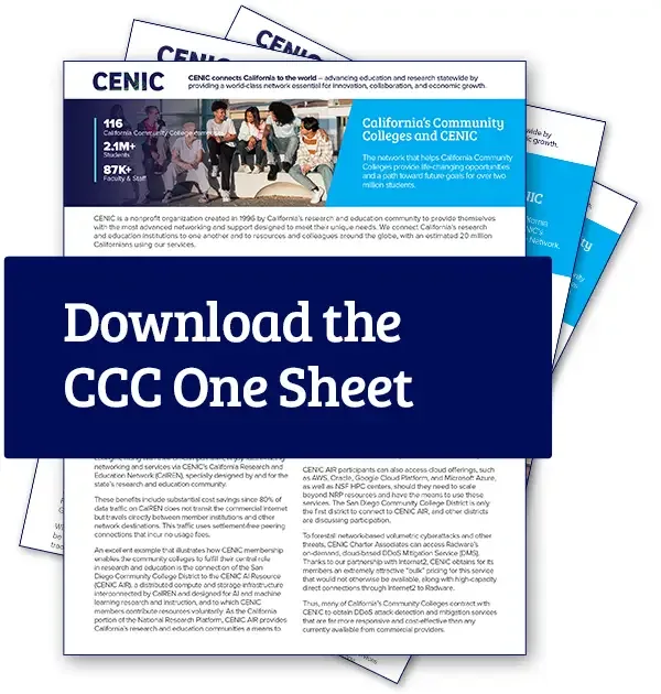 CENIC is helping those leaders of tomorrow–and those who educate them–succeed by providing the significant network and security capabilities community colleges throughout the state require. In partnership with CENIC, you’re connected to a global research and education community so your faculty and students can accomplish what they seek to do: kickstart their careers.