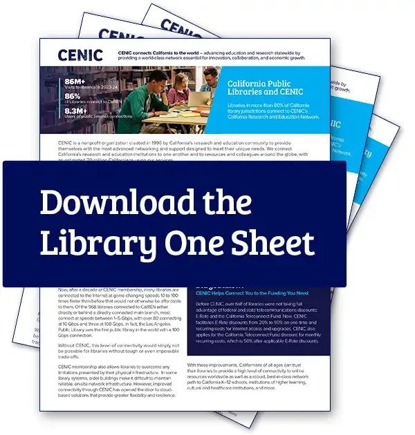Before joining CENIC, three-quarters of California’s libraries had very slow Internet connections—at or below 2 Megabits per second, far slower than many private homes. For two-thirds of libraries, these connections would fill soon after they opened their doors for the day.