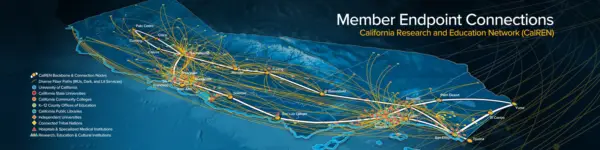 You can see at the map above that the CalREN backbone nodes are spread throughout California and sometimes cluster in specific geographic areas. It can sometimes be very useful for network engineers and others to know which backbone nodes their institutions connect to. At our list of CalREN Sites by Backbone Node, you'll find a list of all the CalREN backbone nodes along with the institutions that connect to them.