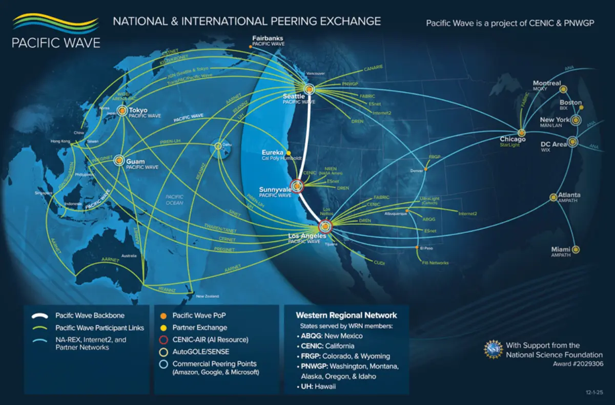 Building on this legacy, NSF’s initial International Research Network Connections (IRNC) TransLight/PacificWave award in 2005 to the University of Southern California launched a new era of high-capacity international networking, with the University of Hawai’i as a key supporting partner alongside the Corporation for Education Network Initiatives in California (CENIC) and the Pacific Northwest Gigapop. This award supported the development of Pacific Wave as a distributed exchange facility and enabled the termination of Australian research and education network AARNet’s SX-Transport links connecting Australia to Seattle and Los Angeles via Hawai’i—the first 10 Gbps submarine fiber connections across the Pacific for research and education.